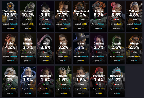 Caustic's rise in popularity has seen other defensive Legends fall off, with Bangalore, Newcastle, Revenant, and Catalyst all being the biggest droppers of the week.