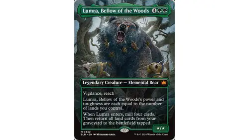 Lumra, Bellow of the Woods, is a more realistic-looking bear, at least in Arita's interpretation. His artwork is only on the borderless version of the card, while Matt Stewart and Allen Douglas have worked on the standard and showcase "Field Notes" version (thanks, Scryfall).