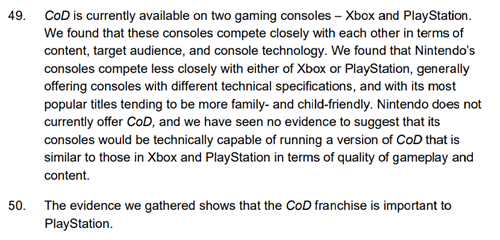 "Nintendo does not currently offer CoD, and we have seen no evidence to suggest that its consoles would be technically capable of running a version of CoD that is similar to those in Xbox and PlayStation in terms of quality of gameplay and content," the CMA said.