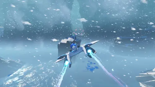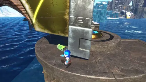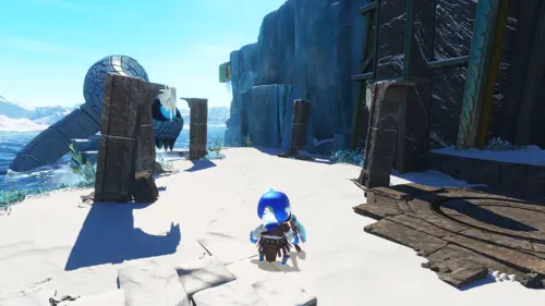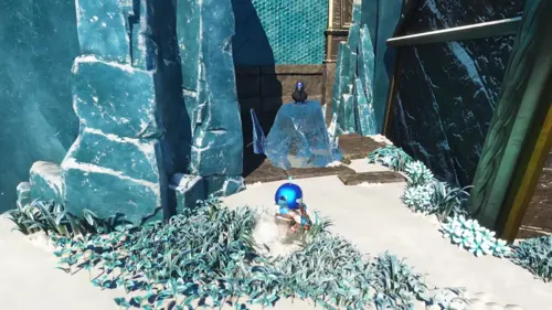 Along the path beyond the fourth Raven, there should be a circular section, with an ice block in the middle. Break this ice block, and then blow into your controller to sound the horn.