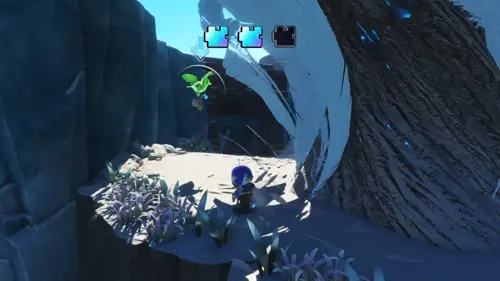 Head back onto the main path, and to the right of the spiky ball-throwing enemy there should be a blue wall that you can break through with your axe. Head through this area and ahead should be a tree with feathers in it.