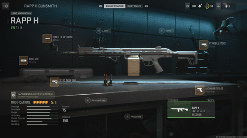 I'd class Rapp H as more of a big-mag assault rifle, to be honest. It's similar in nature to the Lachmann ARs in terms of speed and design, but a bulky 75-round ammo crate slows you down significantly. That just means we need attachments to get it back up to place though, and all the while, we need some more range and recoil stability.