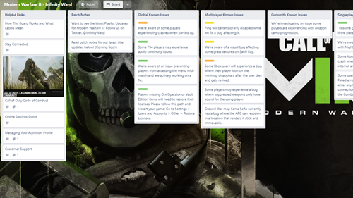 The Trello board for Modern Warfare 2 was shared just after launch by Infinity Ward and is available publicly for everyone to see. You can enter it and even use it to find out information, such as the server status, how to manage your Activision profile, and customer support.