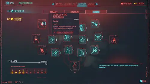 For stats and perks to back the monowire up, it is all about Reflexes and Blades. A relatively recent change has made it so that instead of the Cool stat, monowire now scales with Reflexes, and is affected by Blades perks instead of blunt weapons. This change has made the monowire deadly, with some amazing perks to back it up.