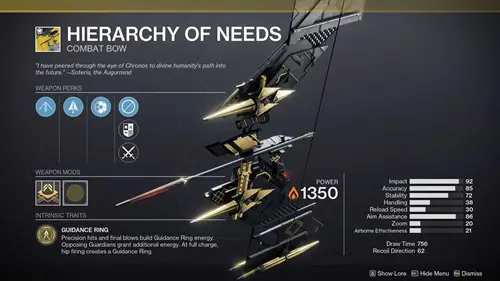 As mentioned, Hierarchy of Needs is an exotic bow and a Solar one at that. The bow is massive, basically a big sheet of metal with a string across it. It is certainly one of the more interesting-looking weapons in the game and also has some of the most interesting abilities. The exotic perk is called Guidance Ring.