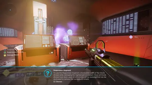Once this happens, an enemy with the Suppressor augment will spawn in on the upper walkways. Defeat them and take the Suppressor. Then, shoot Praksis while standing underneath each of the drones. This will open the doors on the far left, middle, and far right of the room. In each will be a shield drone, destroy it and his shield goes with it.