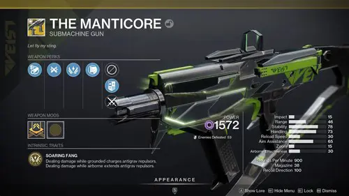 As fun as the exotic perk is, what makes the gun great is the gun itself. The Manticore is a Void SMG, and for all intents and purposes, it is the Funnelweb but better. Funnelweb is one of the best guns in the game, it is a high-fire rate, accurate SMG that is great for mowing down opponents in the Crucible.