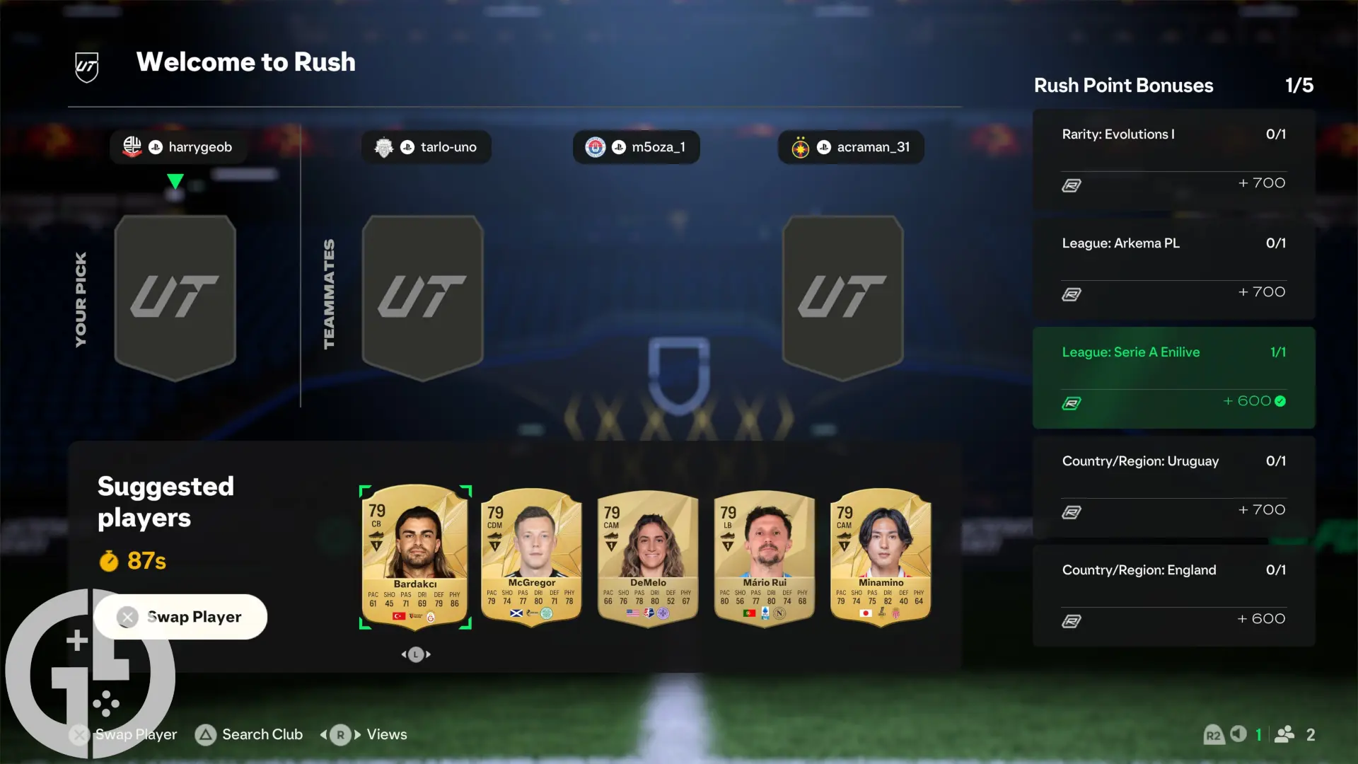 You'll likely earn more Rush Points from a loss with several bonuses than from a win with none, so it's more than worth the small sacrifice of a slightly weaker team.