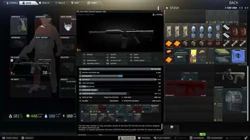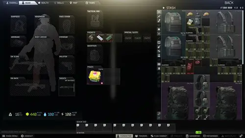 Heading to the Character tab, you will be able to see your stash, overall stats, current loadout, PMC health, skill progression, any maps that you have obtained, and all of your currently active tasks.