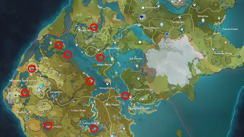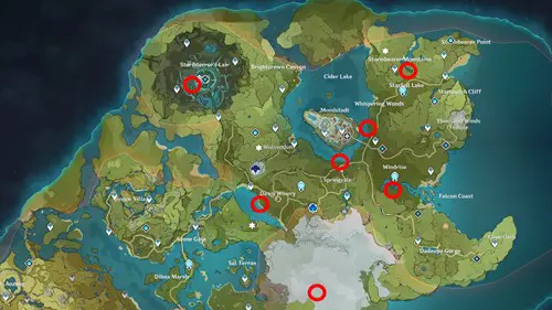 - Two spots on Cider Lake that are east and west of the Mondstadt gates