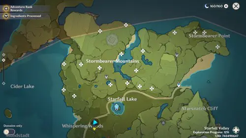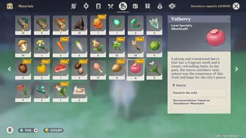 Valberries are only local to Mondstadt, where they grow in the wild regions of the Stormbearer Mountains and Stormbearer Point. Once picked from a flower, Valberries respawn after two days. Above, the locations where Valberrry spawn is marked with a clover sign on the map.