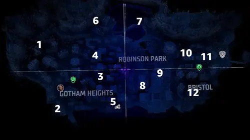 Let's start from the top. The 60 Batarangs are spread out across the five boroughs of Gotham, with 12 to find in each region. North Gotham is, as you might expect, the northernmost section of the city. This borough includes Gotham Heights, Robinson Park, and Bristol. Here are the locations of all 12 Batarangs located in North Gotham.