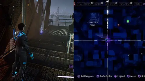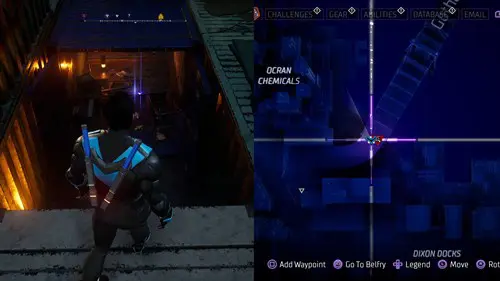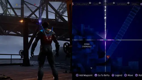 10. From Ocran Chemicals, go southeast under the bridge. You should notice the glow effect of the Batarang coming from inside one of the shipping containers. Get on top of the containers to find a way in, then drop down to grab the Batarang.