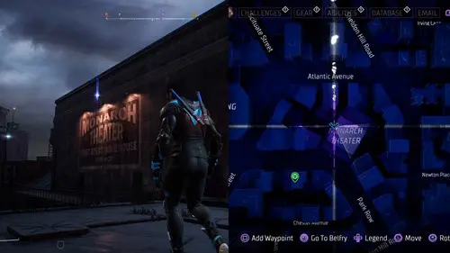 9. Next, we are heading to the famous Monarch Theater. Around the western side of the building, near the roof there is a painted sign for the Monarch Theater, just above that sign is where you will find your next Batarang.