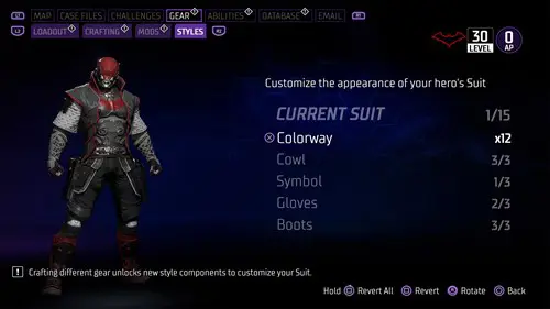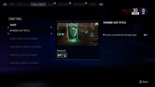 To find out exactly how to unlock them, go to the Crafting section of the Challenges menu. These challenges are how you unlock new colour schemes, known as colourways, and transmogs. Most of the challenges are straightforward, for example, to unlock the Shinobi suit style, you need to craft a Shinobi suit. Whether or not you can craft a Shinobi-style suit is a bit random, you'll need a blueprint for a suit with this style. Your best bet is to keep a regular eye on your crafting menu, when you see a suit with a style you do not have the transmog for, crafting it will generally get you the transmog for it.
