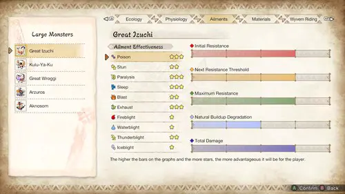 As you fight the monster more and more times, you’ll learn new things about it. Even after initially checking out its stats and affinities, it’s always worth coming back to your log and seeing if anything is changed. If you’re hitting a brick wall with a particular foe, this will be your all-in-one resource.