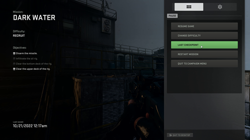 Firstly, load up the 12th mission in the Modern Warfare 2 campaign, 'Dark Water'. This sees the taskforce storming an oil rig as they search for one of the stolen missiles. Shortly into the mission, you'll ascend a set of stairs to the upper levels of the oil rig, just after you clear out a couple of enemies in a side office. As you ascend to the top, keep your eyes fixed on the left-hand side of the upper platform. You should see two bright blue portaloos - this is where our enemy is hiding.