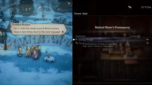 You’ll need a character like Agnea or Throné who can steal items from NPCs. Nab a Sturdy Pickaxe from the former miner hanging out in Orerush’s weapon shop.