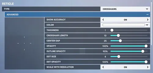 Once you enter these settings, you’ll get to adjust your reticle’s shape, colour, opacity, length, width, and even thickness. You even have the option to give specific heroes different crosshairs in the hero function tab.