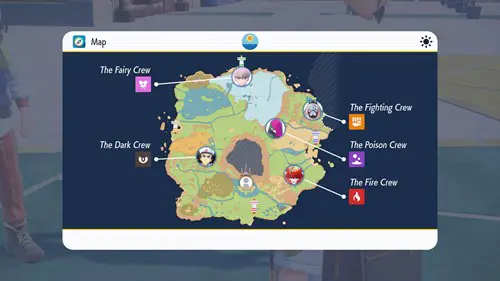 The third story path and objective spanning the map is Starfall Street, which involves taking down the rebellious Team Star. They have five bases throughout Paldea, and you need to clear out each of them to progress. Each of the bases has a theme based on a Pokemon type. Those types, in order from the lowest level to highest, are dark, fire, poison, fairy, and fighting.