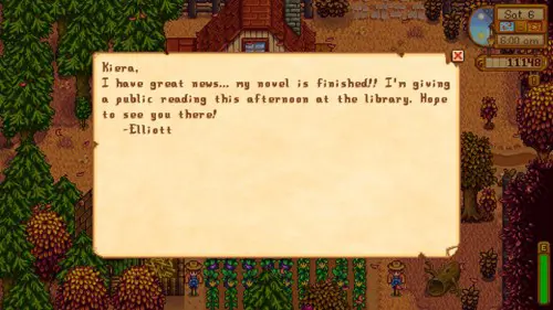 The player receives an invitation in the mail to attend Elliott’s book reading at the library. Upon arriving Elliott greets the player and expresses relief at finishing his book. Almost the entire town is present as Elliott commences the book reading (which will be whichever genre the player chose in the second heart event). Elliott finishes the reading and dedicates the book to the player.