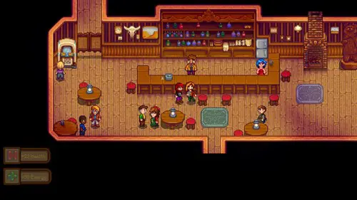 The player enters the Stardrop Saloon and is joined by Elliott who is celebrating that he has had a productive day of writing. Elliott buys them a drink and they toast. Elliott proceeds to dance and the player laughs.