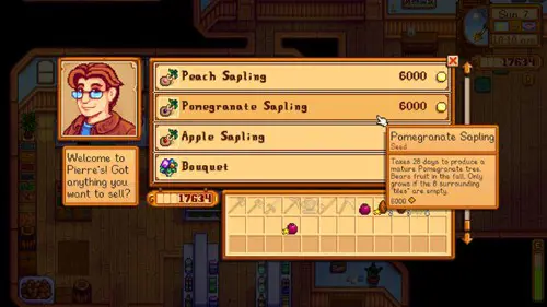 This means by Fall you should have a fully grown pomegranate tree ready to harvest. Elliott’s birthday happens to be Fall 5 so if you grow a Pomegranate in time for this and gift him one, you can receive a x8 bonus to friendship.