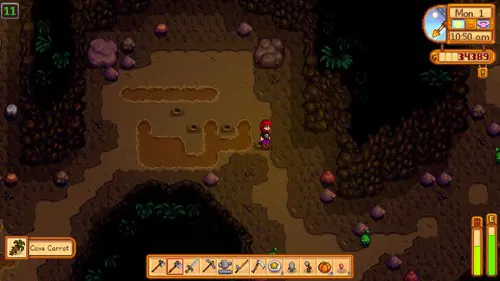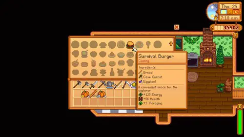 Alternatively, if you haven’t invested in animals on your farm yet, or don’t feel like a trip to the Mines, the Survival Burger is an option. The recipe for this is given to the players when they achieve foraging level 2. It requires bread (the recipe of which can be bought from the Stardrop Saloon), Cave Carrots and Eggplant. However, as this recipe requires you to have Cave Carrots you may need to go to the mines for them. They can be located easily enough, by hoeing the dirt patches in the mines.
