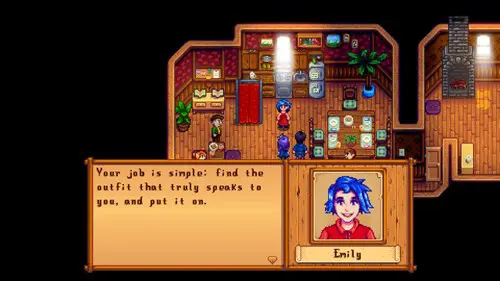Emily sends the player an invitation for an event in the mail, which takes place at the mayor’s house. She calls the event clothing therapy, in this she instructs different villagers to get changed into any clothes they like, to reveal their true personalities.