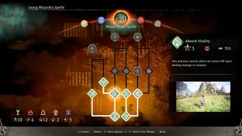 Within the Wood tree, you will find a particularly useful spell known as Absorb Vitality. This works at replenishing you and your reinforcements help when dealing damage to enemies. It’s a great tactic to use that prevents you from using your own health flasks to replenish your health.