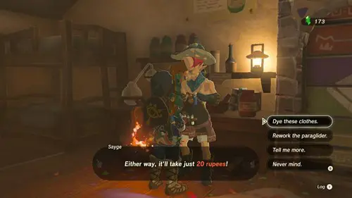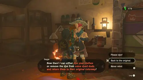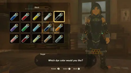 After that, select the dialogue option that says "Choose a color" to select the different colors that you can dye your clothing with. Just keep in mind, whatever color you choose, you must have five items of the desired color and 20 Rupees to proceed with the dyeing process.