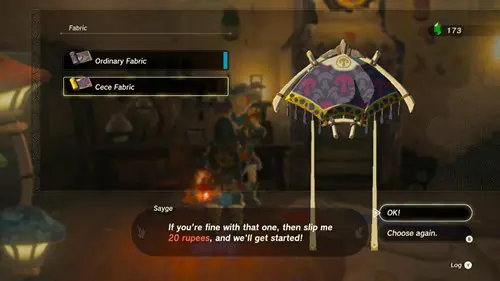 Once that is done, select the dialogue option "OK!" to complete the rework in exchange for 20 Rupees. Sadly, you cannot alter the color or shape of your glider, though the fabric rework sure gives a fresh look to it.